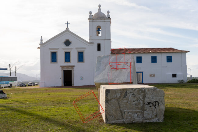 Allen-Allen do Mosteiro, 2025 (da série Allen-Allen, 2019/25); Pintura eletroestática sobre alumínio; Dimensões variáveis; Coleção do artista; Vista da escultura montada na exposição “Para nadar é preciso vencer o mar”, na cidade de Serra (ES), Mosteiro Jesuíta dos Reis Magos, na Galeria Belchior Paulo; Registro fotográfico: Caca Lima.